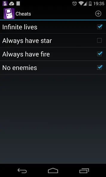 The emulator support GameShark GameGenie cheat codes so you can tweak game the way you like. You can enter cheat code and enable or disable them on the fly while the game is running. This feature let you experiment with different gameplay option and unlock hidden content.